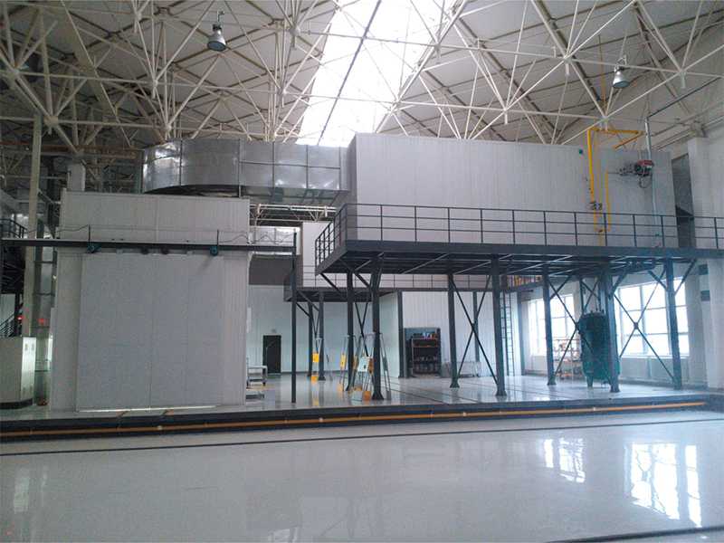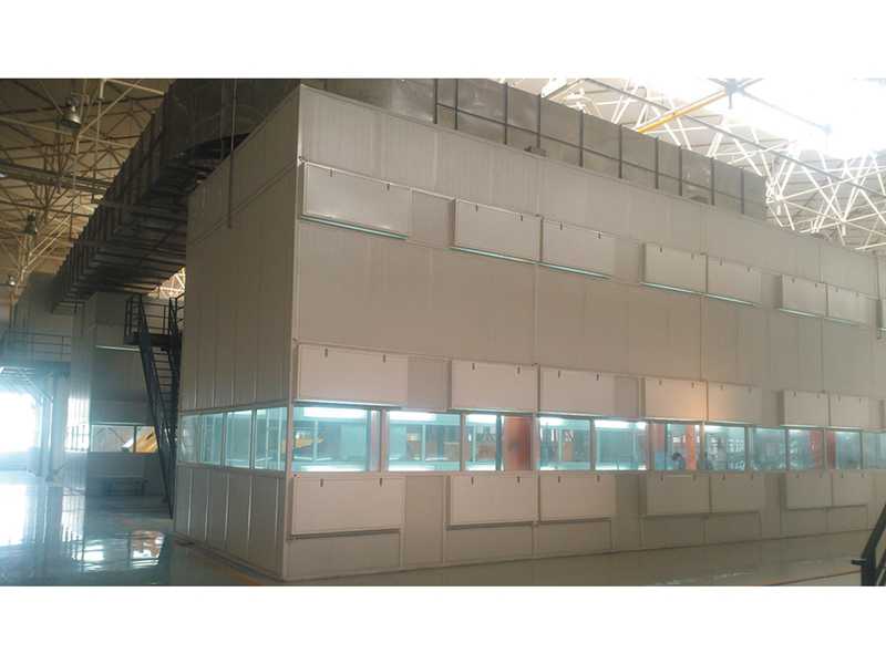 喷漆时,外部空气经过初级过滤网过滤后由风机送到房顶,再经过顶部过滤网二次过滤净化后进入房内。房内空气采用全降式,以0.2-0.3/s的速度向下流动,使喷漆后的漆雾微粒不能在空气中停留,而直接通过底部出风口被排出房外。这样不断地循环转换,使喷漆时房内空气清洁度达98%以上,且送入的空气具有一定的压力,可在车的四周形成恒定的气流以去除过量的油漆,从而大限度地保证喷漆的质量。
