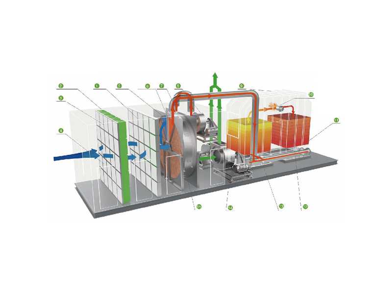经预处理(去除粉尘、颗粒物)后的有机废气流过浓缩转轮时,其中的有机物在转轮吸附区域会被吸附下来,经过吸附净化后的废气(约占处理风量的85% 95%)排放到大气中,一小部分废气(约占处理风量的5% 15%)对转轮冷却区降温后经換热器被加热到180 220℃的脫附温度后,流入脫附区,脱附区有机物从吸附剂一沸石上脱离到加热的气流中,转轮得以再生,脫附后的高浓度VOCs被送入RTO高温焚烧。反应后的高温烟气进入规整蜂窝陶瓷蓄热体,95%的热量被蓄热体吸收井“储存”起来,温度降低到接近RTO入口温度。蓄热体温度升高后,通过切換阀或旋转装置切换气流流向,分别进行蓄热和放热,实现热量的有效回收利用。